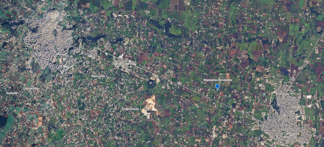 We are located 30 minutes from Brindisi airport and 60 minutes from Bari airport. We are located between Carovigno and Ostuni which are located about 5-10 kilometres off the fast coast road which connects the 2 airports. The house is called Masseria Annabella and the address is Contrada Parco Grande, 72012 Carovigno. There is no house number for the house. There are green metal gates with the name of Masseria Annabella on the front.The exact coordinates are as follows: 40.7131647445, 17.6364228968The house is at the end of small road that runs off the main road between Carovigno and Ostuni (SS16). You will see the name of the house on a sign which marks the beginning of the small road.